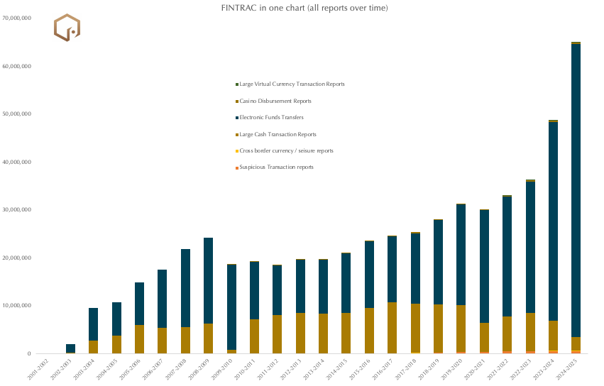 Each year, FINTRAC’s annual report provides one of the only publicly available windows into Canada’s illicit finance landscape. They report on a wide variety of important metrics, including how many disclosures they share with partners, the kinds and number of reports they’ve received, and the number of disclosures provided to law enforcement for criminal non-compliance with Canada’s anti-money laundering and counter-terrorist financing regime. I’ve been conducting independent analyses of these reports since 2022, and I maintain a unique dataset that compiles most FINTRAC-reported metrics back to the Centre’s inception. This enables me to evaluate not only year-over-year changes but also long-term trends in Canada’s counter-illicit finance system. As always, I’ll share charts and visualizations of this year’s data further below.