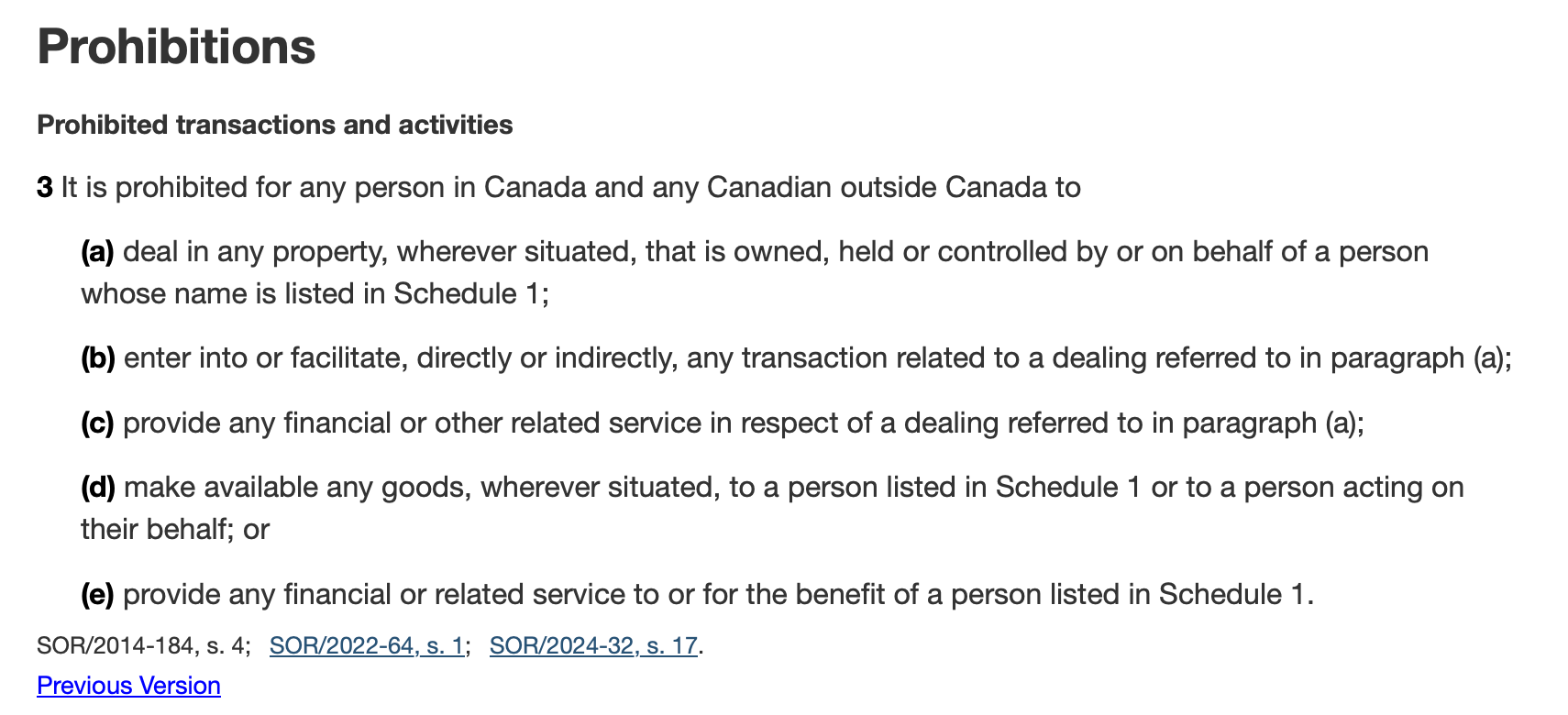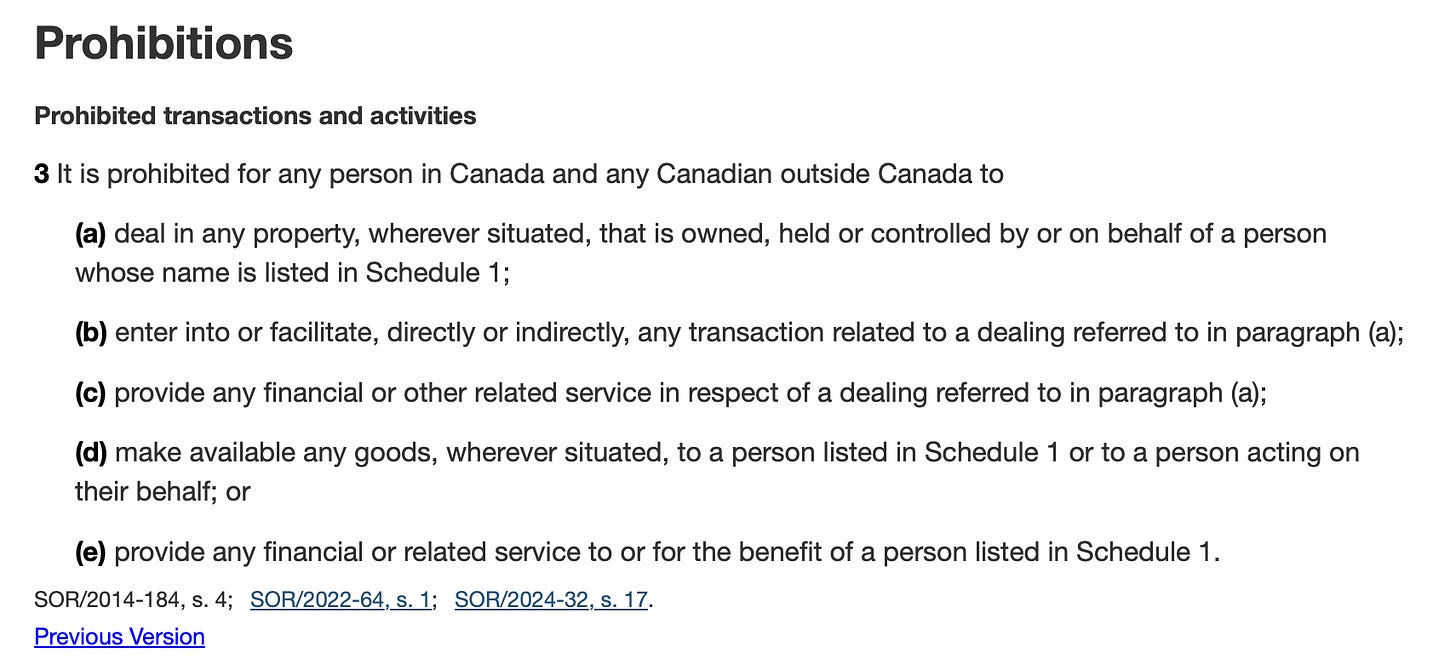 In July 2022, RT was sanctioned under Canada’s Russia Sanctions (SEMA). Some media reports have suggested that this was a breach of sanctions. Global Affair’s Canada’s sanctions page says the Regulations “impose an asset freeze and dealings prohibition on designated persons listed in Schedule 1, which include both individuals and entities.” The actual regulations are worded a bit more vaguely, omitting the language of broader sanctions.