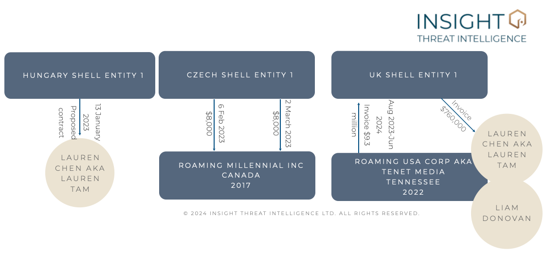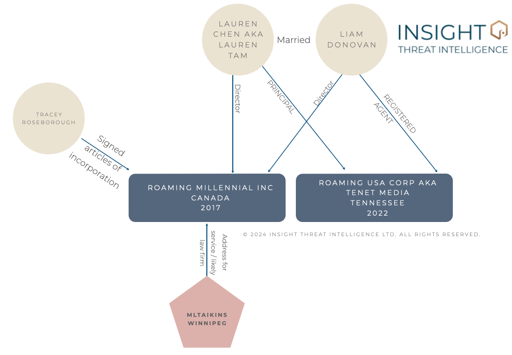 Now that we’ve established that Tenet media is very likely US Company-1 in the indictment, it’s worth taking a closer look at Chen/Tam, Donovan, and their corporate holdings. Lauren Chen’s real name is Lauren Yu Sum Tam (Lauren Tam, as per the registration for Tenet Media), and Chen/Tam’s husband is Liam Donovan. These two are also directors of the company Roaming Millennial Inc., established in Canada in 2017.2 (Roaming Millennial is also Chen/Tam’s YouTube moniker.) Roaming Millennial is very likely Canadian Company-1 in the indictment. Tenet Media is described as a subsidiary of Roaming Millennial Inc, but I haven’t found any legal documents to establish that fact. Regardless, Chen/Tam and Donovan control both entities.