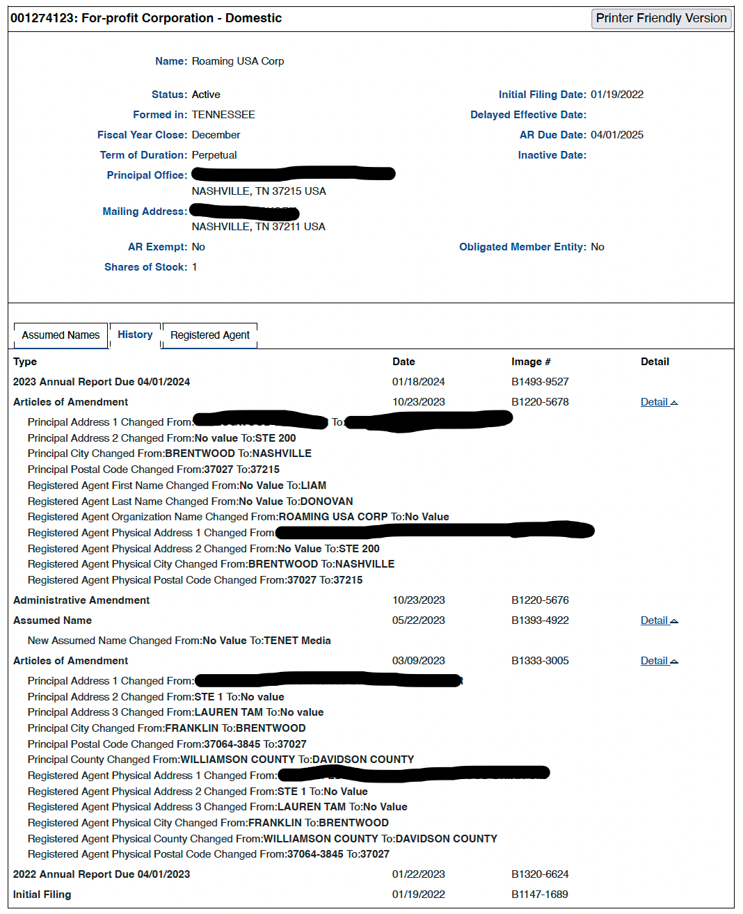 The indictment refers to entities as “US Company 1”, “Canadian Company 1”, “Founder 1”, and “Founder 2” and indicates that these companies and founders have a significant connection to Canada. US Company 1 has been widely reported to be US-based Tenet Media. There’s compelling evidence that this is the case, and I recommend you review some of these sources to see that evidence. Journalist Aric Toler does a great job of linking the indictment to open information. You can review his thread here. Plenty of details match. For instance, the indictment says Founder 1 incorporated a US company in Tennessee on or about January 2022. This matches the date and location for the incorporation of Tenet Media, which was incorporated on 19 January 2022 under the name Roaming USA Corporation but changed to Tenet Media a few months later. The business was incorporated by Lauren Tam and Liam Donovan was later added as a registered agent (see corporate document below).