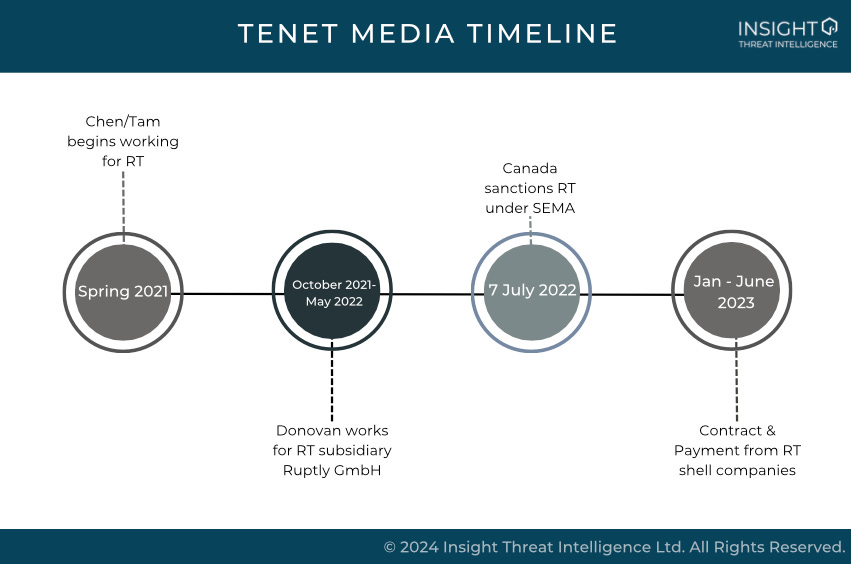 Hello Insight Monitor subscribers! Welcome to another week of exciting illicit financing news and analysis. Today, we’re looking at the case of Tenet Media, Russian media outlet RT, influencers and foreign interference. This FI (and possibly sanctions evasion) case is fascinating and certainly something we’ll be following for some time to come. I’ve taken a few hours to read through the US indictment and chart the timeline of activities, key players, financial transactions, and corporate structures to the best of my ability. There’s some real nuggets in here, and I’ve visualized some of the information to make it clearer. I’ll endeavour to keep this analysis current as we get more information. As always, thanks for reading, and if you haven’t subscribed, please do! This is a reader-supported publication and one of the only ones in the world that covers illicit financing. Let’s get into it: