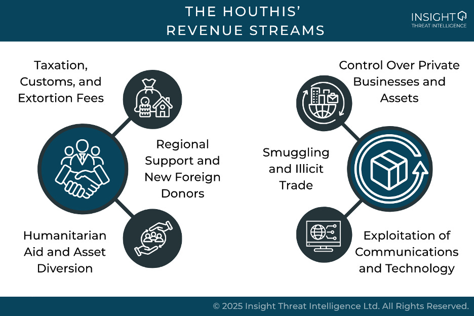The UN Panel of Experts on Yemen highlight that the Houthis generate significant revenue, approximately YR 3.392 trillion in 2023 (US 13.6 billion) per year. The group has recently increased taxation, customs duties, and imposed new levies. These include customs fees on goods entering Red Sea ports under their control, which remain critical gateways for goods entering Yemen. The Houthis have also been extorting shipping agencies, allegedly demanding payments in exchange for not targeting vessels. This maritime extortion could generate up to $180 million per month.