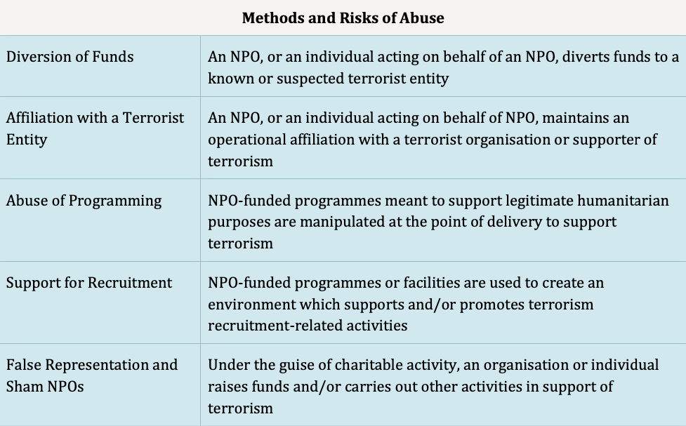 The Financial Action Task Force (FATF) outlines more types of abuse and risks for the sector, above and beyond just terrorist financing.