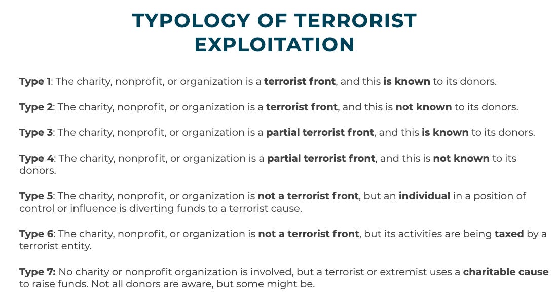 For my forthcoming book on terrorist financing (which I’ll link to as soon as it’s available for pre-order), I developed a typology of the seven main ways that terrorists abuse charitable activities. This involves differentiating the organization’s level of complicity and that of the donors. The most important thing to remember here is that rarely is an organization a total terrorist front; instead, most of the time, one or more people in positions of control or influence are the problem. As such, it’s imperative that we investigate the individuals rather than the organization itself.